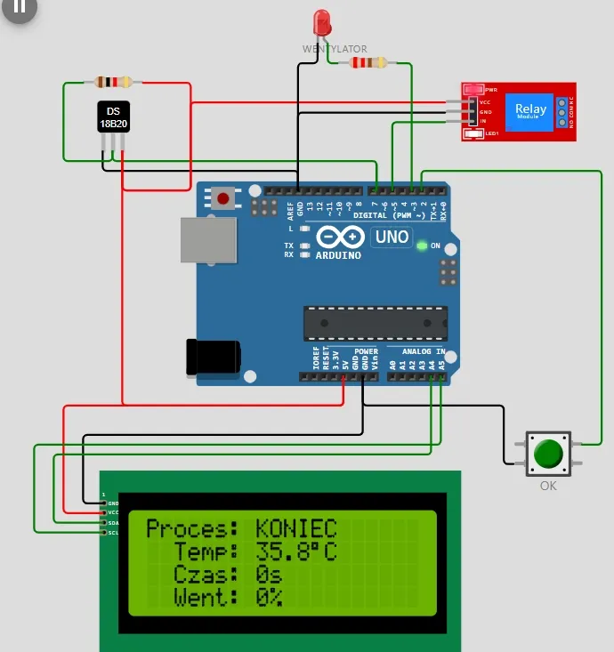 Uwaga: Na schemacie zamiast wentylatora wykorzystano diodę LED (wentylator nie był dostępny w bibliotece elementów). W tym miejscu należy podłączyć sterownik lub tranzystor wentylatora — nie podłączaj wentylatora bezpośrednio do pinów Arduino, ponieważ grozi to ich uszkodzeniem!