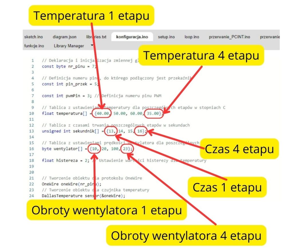 Chcemy, aby etap 3 pracował w 55 °C przez 600 s z wentylatorem 40 %:Kod_010 – przykład dla etapu 3 123float temperatura[] = {40.00, 50.00, 55.00, 35.00}; <!-- etap 3 = 55 °C -->unsigned int sekundnik[] = { 13, 14, 600, 16 }; <!-- etap 3 = 600 s -->byte wentylator[] = {10, 20, 40, 23 }; <!-- etap 3 = 40 % --> -